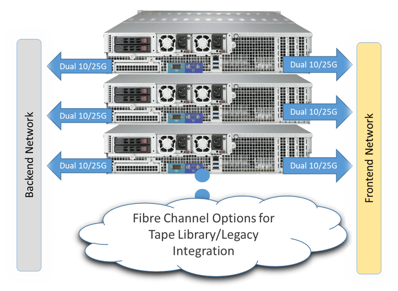 A minimum of two (2x) 10GB ports are required per node for Commvault HyperScale X installs, one for protected data and one for storage communication between the nodes. It is recommended to have a total of four (4x) ports per node, preferably on two separate cards, two (2x) for data and two (2x) for storage for resilience against network failures. These builds have been designed with this recommendation.