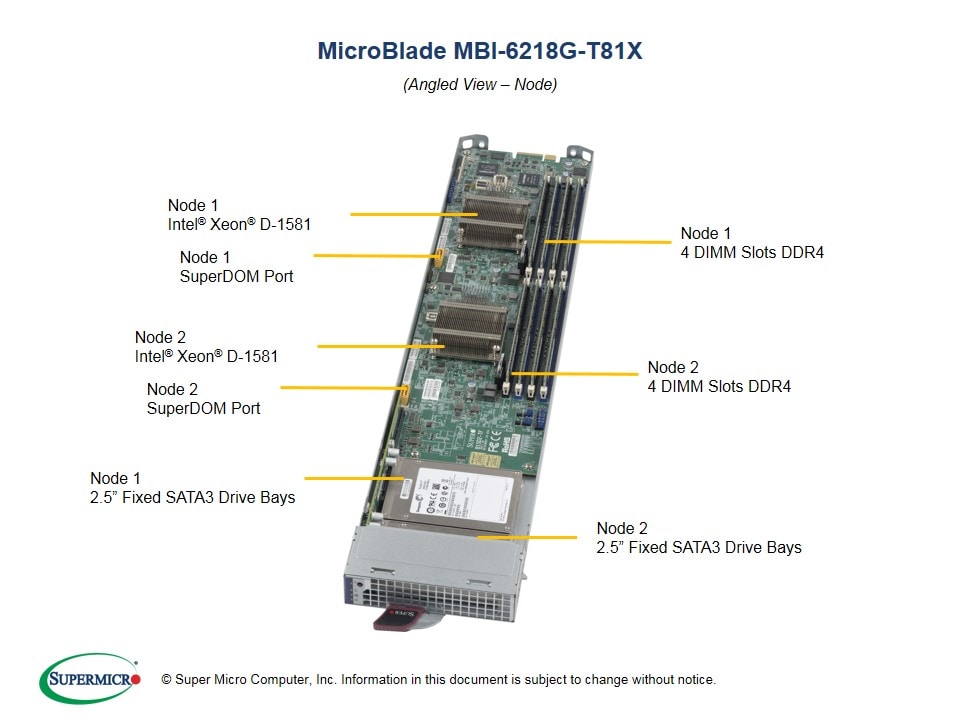 2133/2400MHz in 4 slots3. Up to 1x 2.5" SATA3 HDD/SSD4. Dual 10GbE ports via Intel X5525. 56 Xeon D-1581 nodes in 6U or