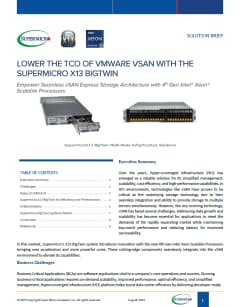Supermicro vSAN ReadyNode™ focuses on deploying VMware vSAN, a hyper-converged solution, as quickly as possible. vSAN provides you with the ability to provision and manage compute, network and storage resources from a single pane of management. Working with VMware, Supermicro delivers an alternative to traditional Fiber Channel SAN based virtualization infrastructure, which is known for its complexity and interoperability challenges. Targeted at a multitude of use cases in tier 1/2 production workloads and Virtualized Desktop Infrastructure (VDI), especially with all flash deployments, Supermicro vSAN ReadyNode™ introduces a new high performance storage tier optimized for enterprise-class virtual environments that is simple, resilient and efficient that reduces the total cost of ownership. It is a perfect solution for Enterprises ROBO and SMBs to efficiently grow and manage virtualized infrastructure for maximum ROI.